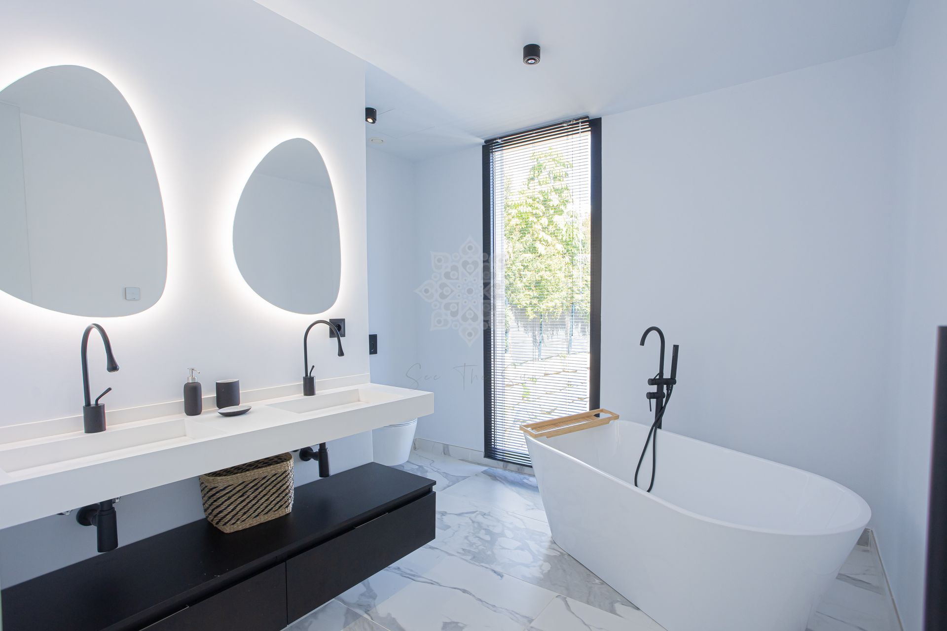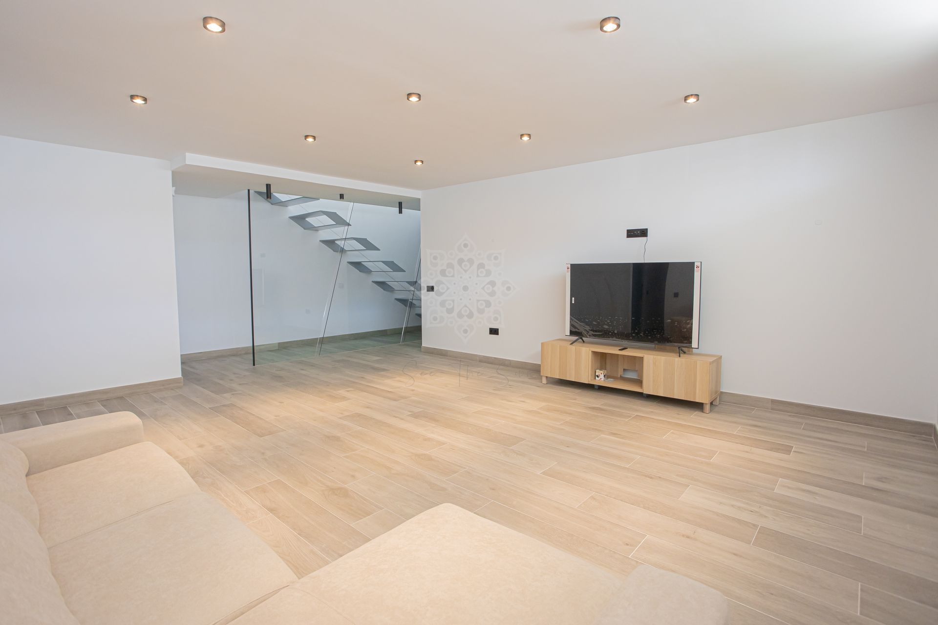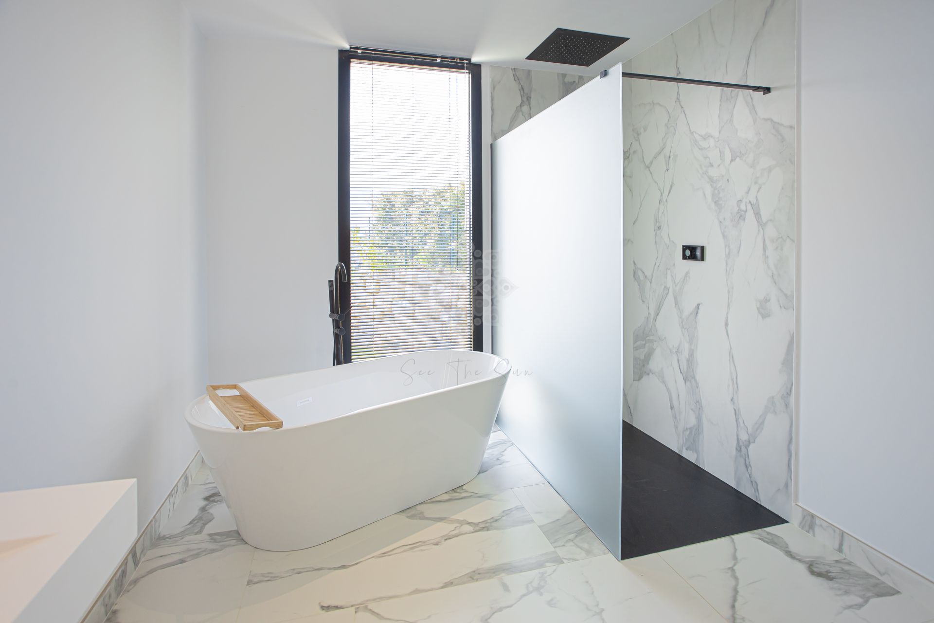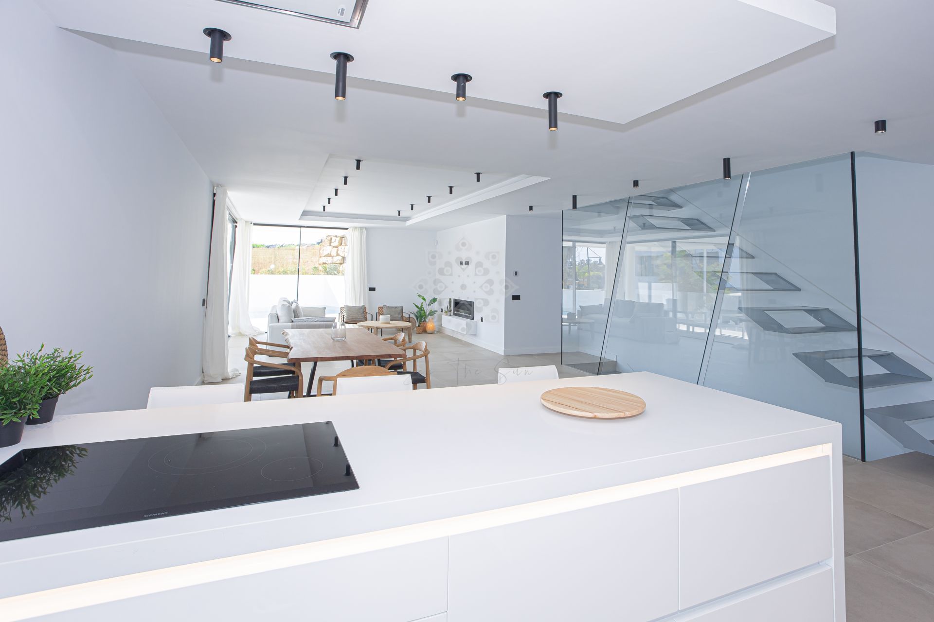 The ground floor offers a guest toilet, an open kitchen furnished and equipped with high-end appliances, a spacious living room with a fireplace and access to a large covered terrace, a saltwater pool and gardens around the Villa. The design is modern, bright and light with floor-to-ceiling glass windows that maximize light and create a uniform effect between the indoor and outdoor spaces.