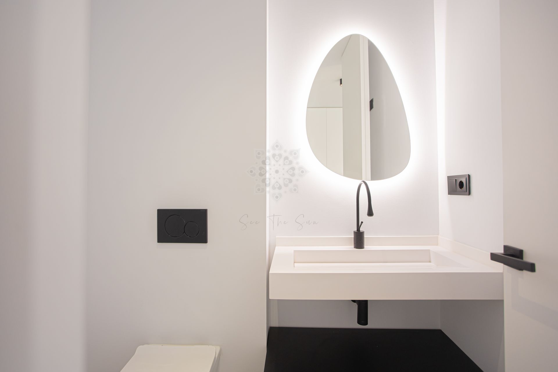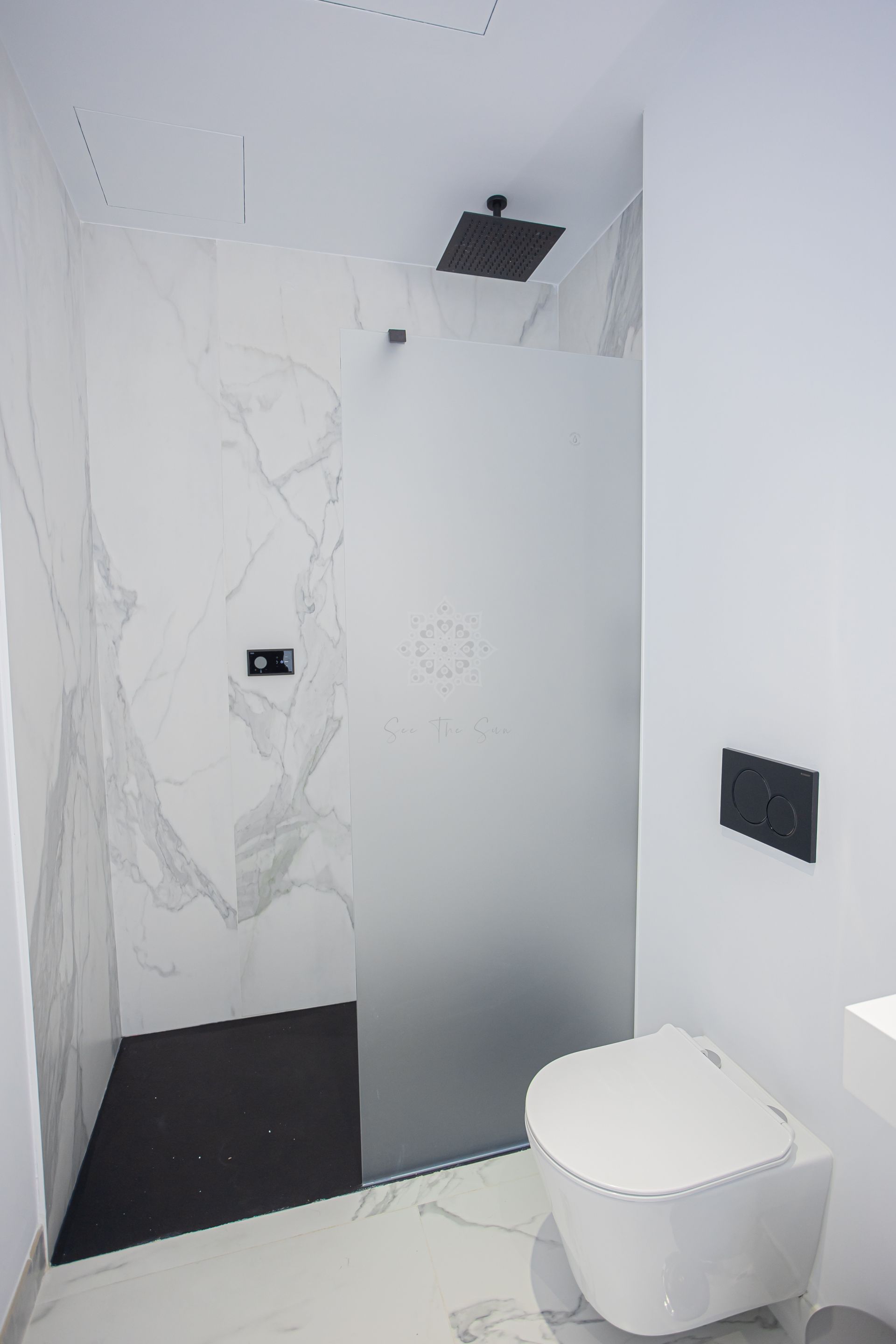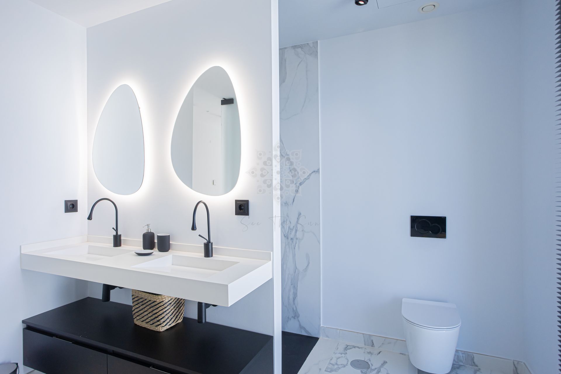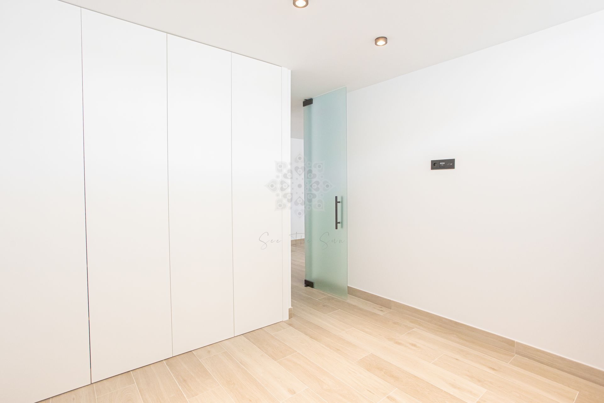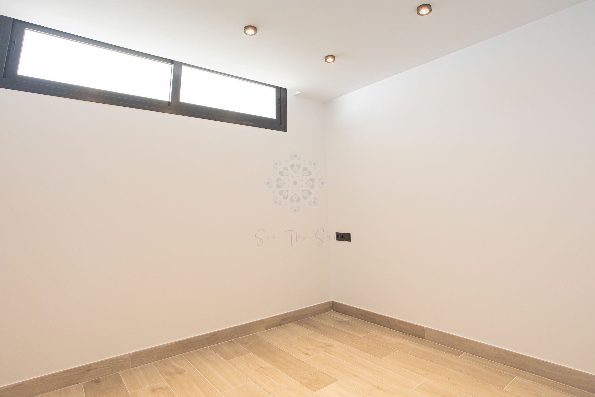 The ground floor offers a guest toilet, an open kitchen furnished and equipped with high-end appliances, a spacious living room with a fireplace and access to a large covered terrace, a saltwater pool and gardens around the Villa. The design is modern, bright and light with floor-to-ceiling glass windows that maximize light and create a uniform effect between the indoor and outdoor spaces.