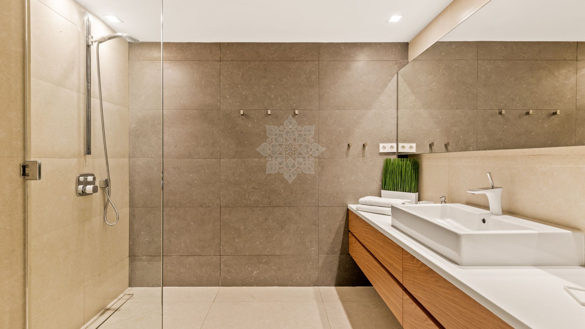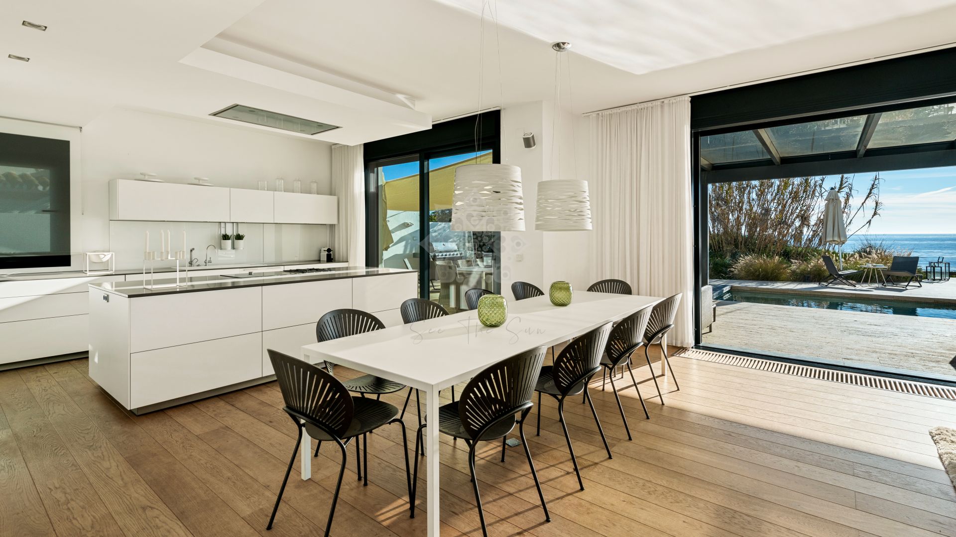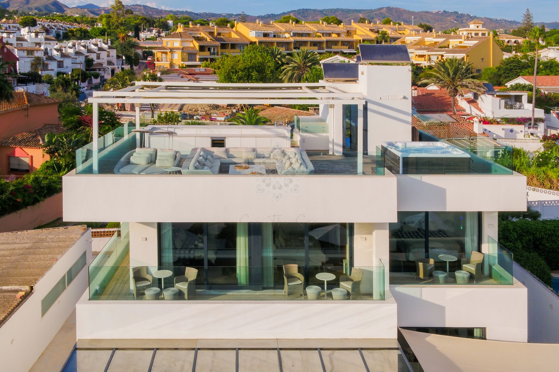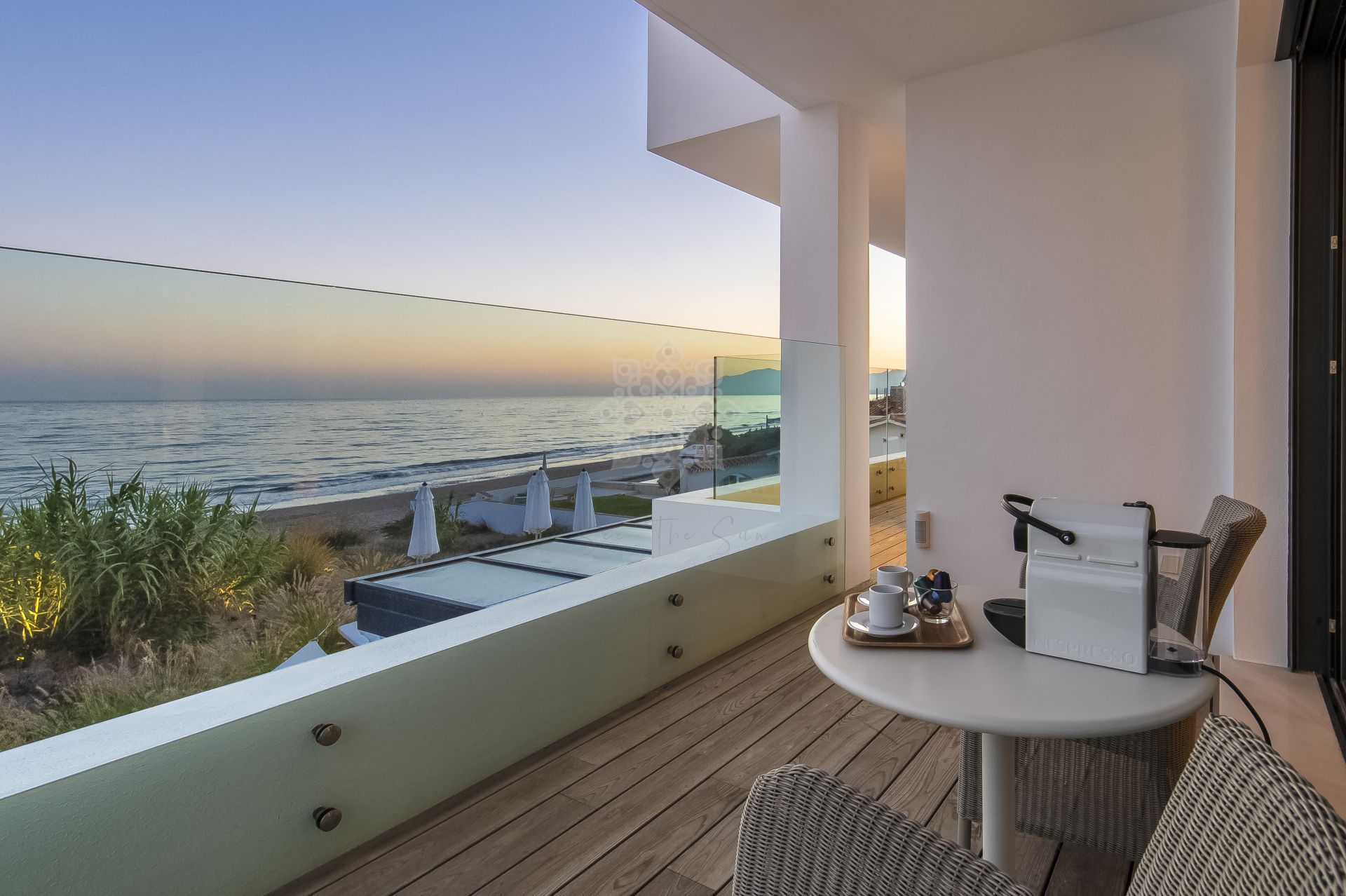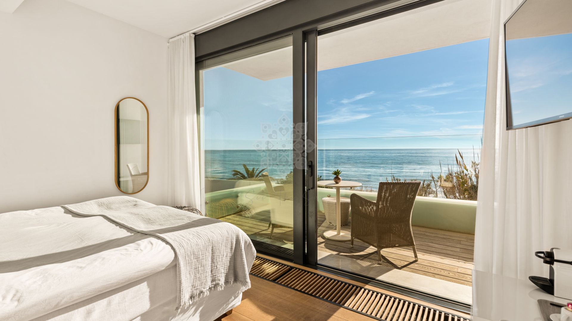 This stunning property, facing south-east, offers panoramic sea views and breathtaking sunsets, combining a modern design with the highest standards of quality and comfort. On the main floor, an elegant double-height entrance hall leads to a spacious living-dining area with large windows overlooking the sea, connected to an open-plan fully equipped kitchen featuring state-of-the-art appliances.This level also includes one bedroom and a fully fitted bathroom. From the living room, there is direct access to the main terrace, which features a heated saltwater swimming pool, an outdoor dining area, and chill-out sofas ideal for relaxing. A private path crosses the dunes and leads directly to the beach, ensuring privacy and exclusivity. On the lower floor, the villa offers a wellness area with sauna and relaxing bathtub, a spacious laundry room, a fully equipped bathroom, and two bedrooms with natural light. The first floor includes three bedrooms boasting impressive sea views and direct access to the terrace. One of the two bathrooms on this level is especially large and also has access to the terrace, which features a sitting and dining area to enjoy the spectacular views. Finally, the upper floor hosts a stunning rooftop solarium with jacuzzi, chill-out area, tables and chairs, and 360° panoramic views of the sea and the mountains.Additionally, the property is equipped with underfloor heating throughout, solar panels, centralized air conditioning, a wireless sound system, LED lighting, and an automatic irrigation system in the outdoor areas. There is also outdoor parking space for up to five cars, providing maximum comfort and convenience. A truly unique villa that combines luxury, technology, and a privileged beachfront location, offering an unparalleled lifestyle by the sea in Marbella.