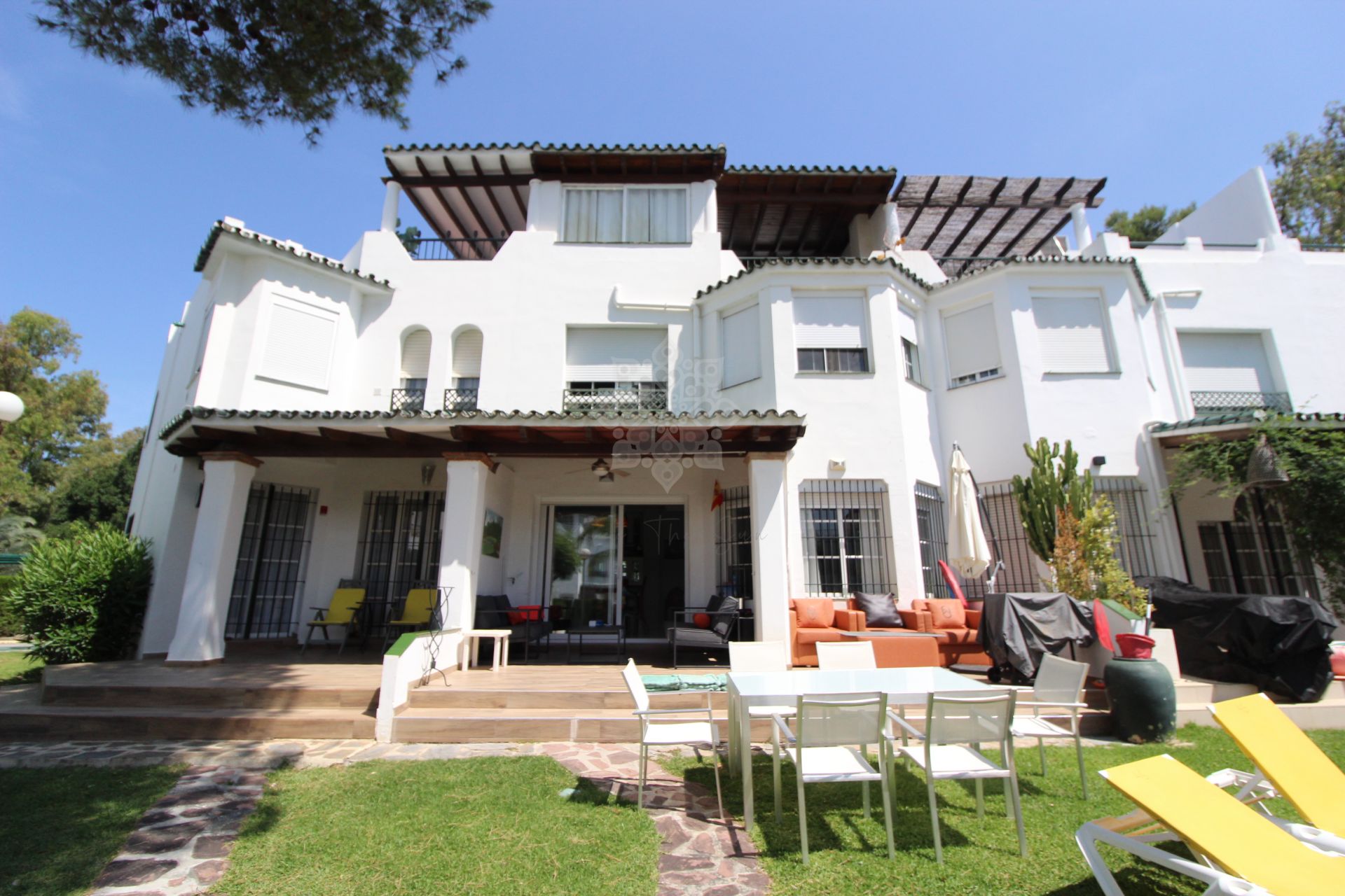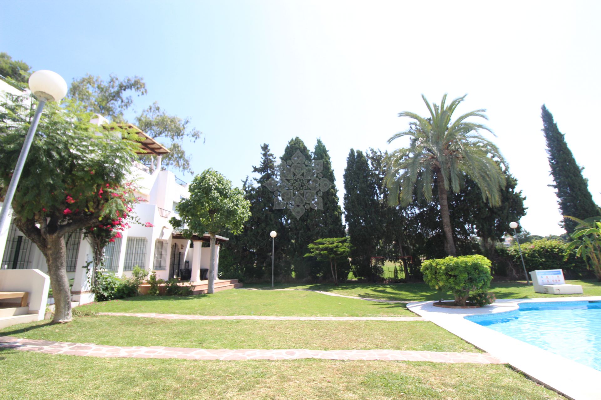 Enjoy the communal garden from the lounge porch! On the first floor are the 3 bedrooms and 2 bathrooms, one of them en suite with shower and large dressing area. New wardrobes in all bedrooms . It is a closed and very well maintained community. The house has several Porches, and huge Solárium with a wooden roof recently put so this new one. Ideal for chill out area and outdoor dinners with barbecue and closed part as well as laundry room. The fantastic panoramic views of the whole wooded area and the mountains of La Quinta. The urbanization is close to everything: Supermarkets, Colleges, Shops, Restaurants etc.. is ideal for Holidays or for families. And perfect to live all year. It has general air conditioning throughout the house and blinds. San Pedro de Alcántara is a 4-minute drive from Puerto Banus. It is for all an ideal house for families and also for investment and enjoy Marnbella with everything next to it;