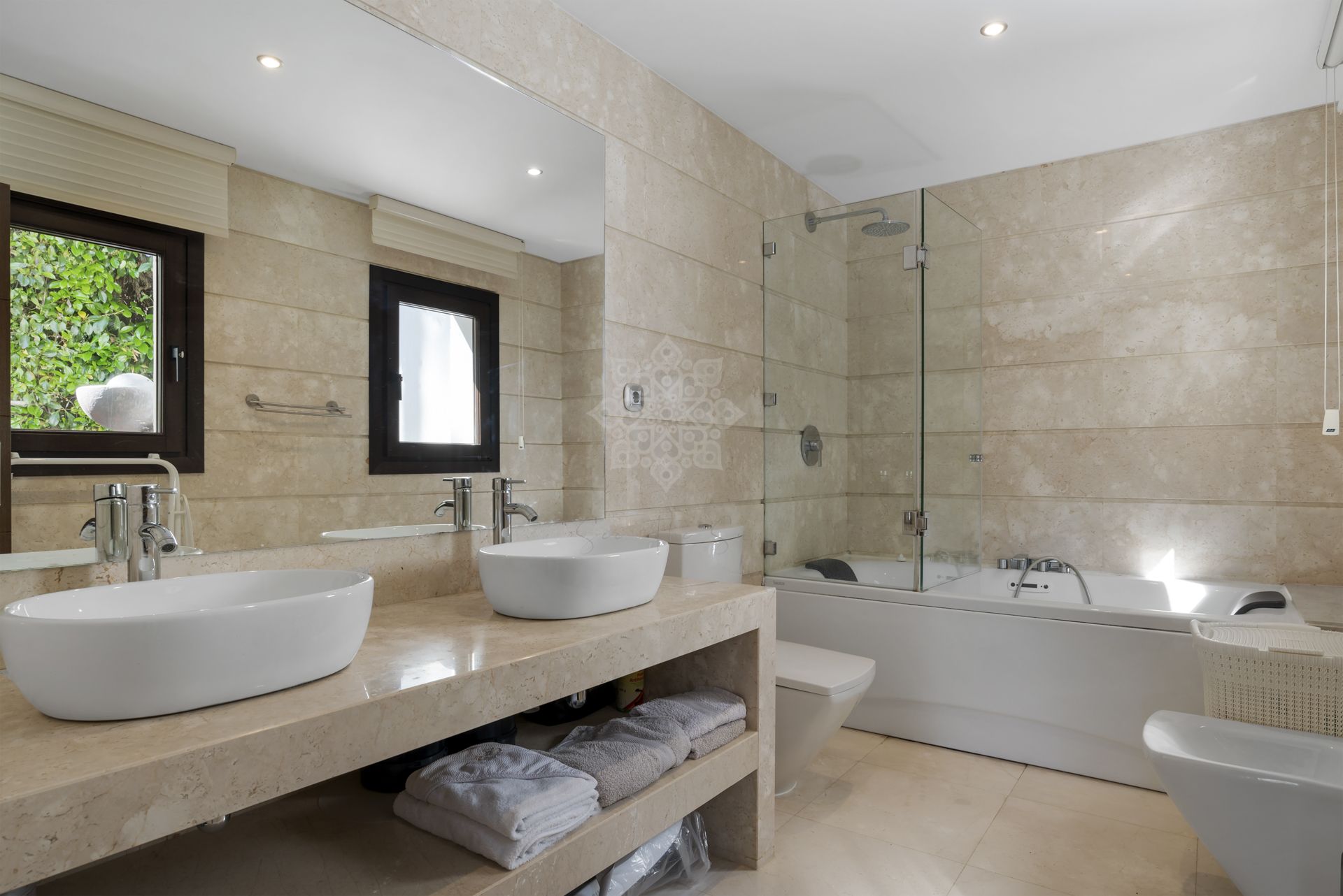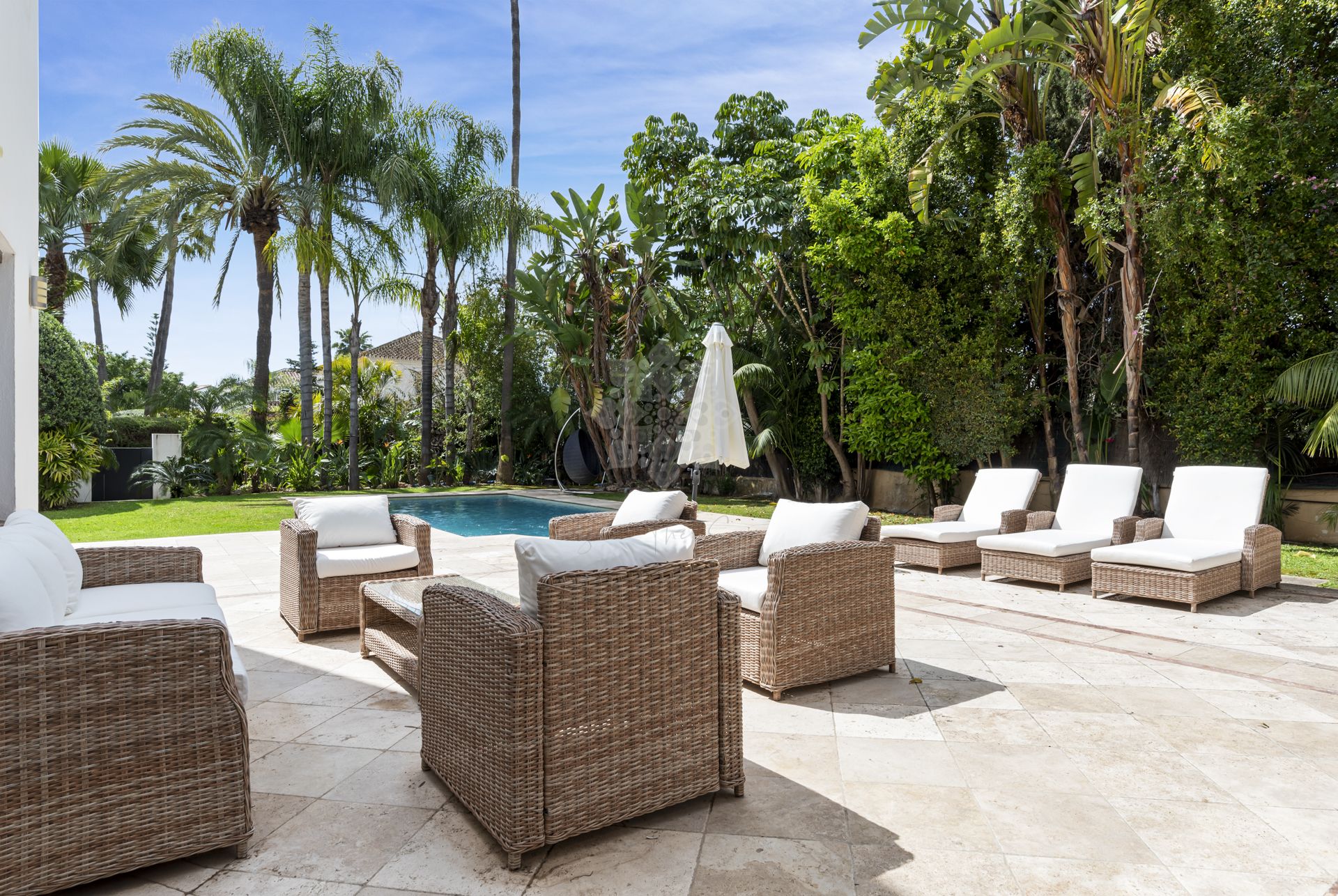 The outdoor area offers a lot of privacy and a mature garden with some large trees. The heated swimming pool is surrounded by a tiled decking with a chill-out area, a bar and barbecue and an outdoor jacuzzi.