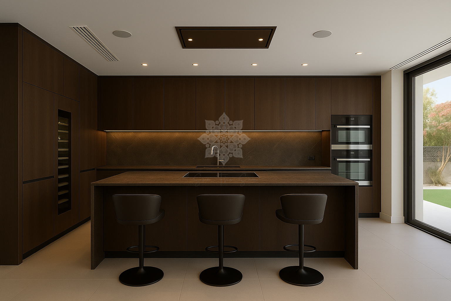 Inside, the home exudes contemporary sophistication. The open-plan living area is enhanced by ambient ceiling lighting and a soft neutral color palette, creating a warm and welcoming atmosphere. The dining area flows seamlessly into the kitchen and social zones, making it perfectly suited for both everyday living and special occasions. A high-end indoor/outdoor sound system ensures effortless entertainment throughout.