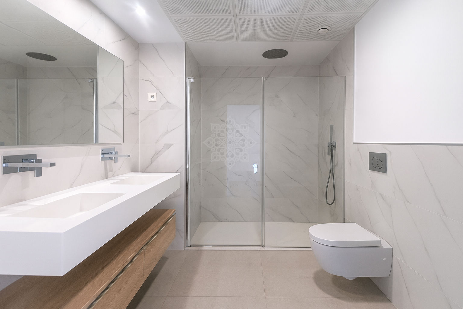 The main floor features a spacious open-plan living and dining area connected to a sleek modern kitchen with premium appliances and ambient LED lighting. Floor-to-ceiling windows open onto a stunning 97 m² terrace with a brand-new private pool — the perfect setting for relaxing, entertaining, and enjoying the Costa del Sol sunshine.