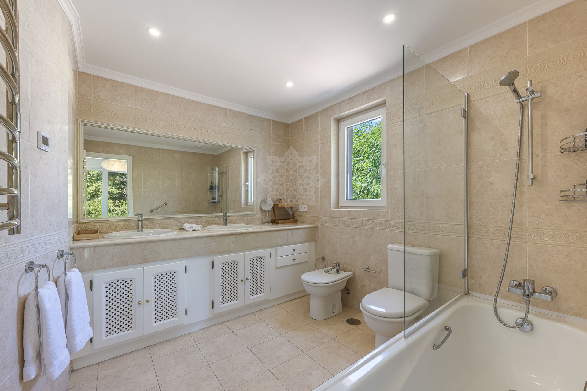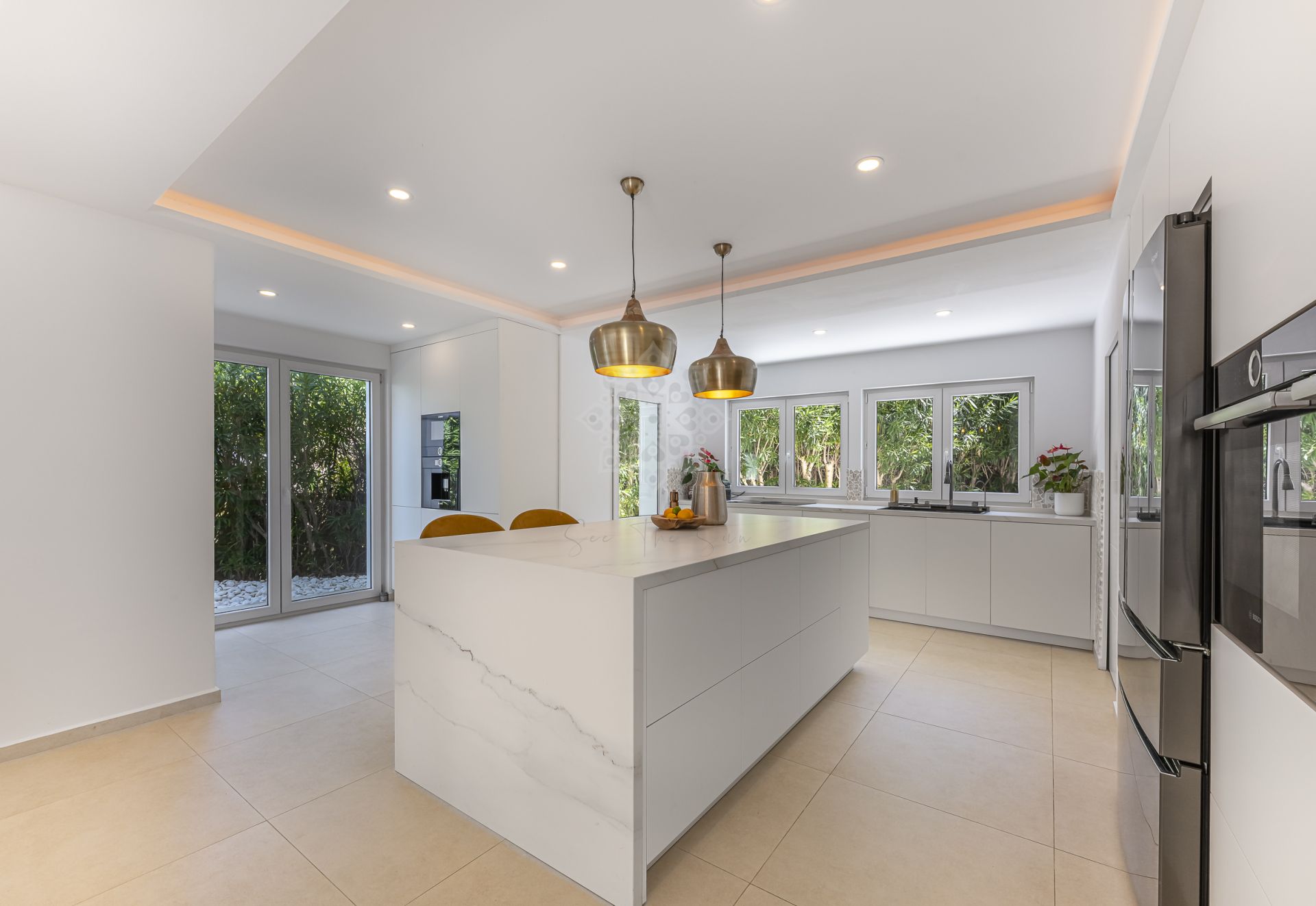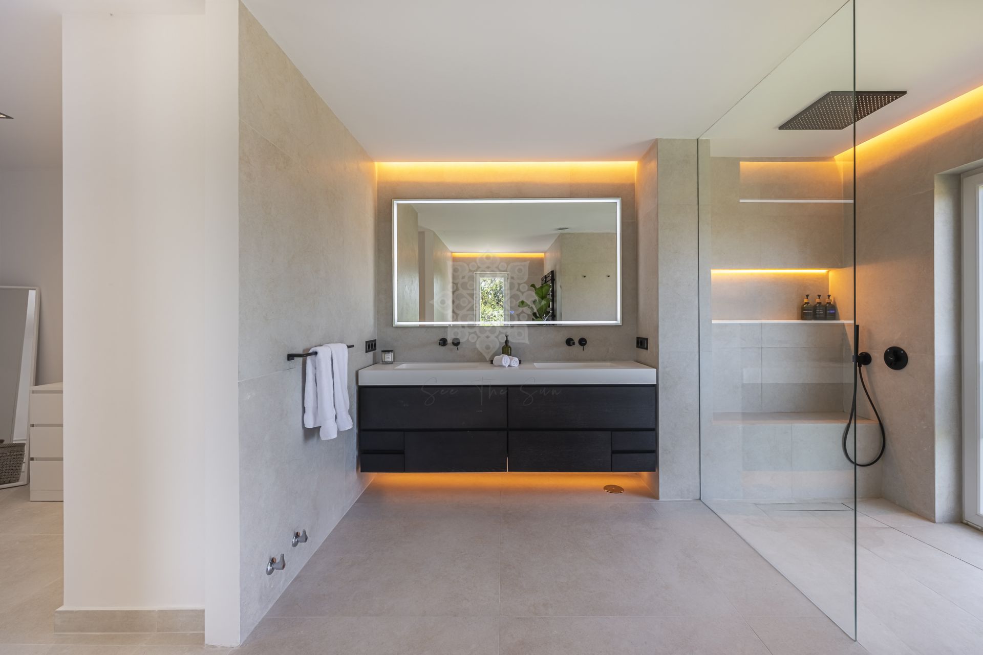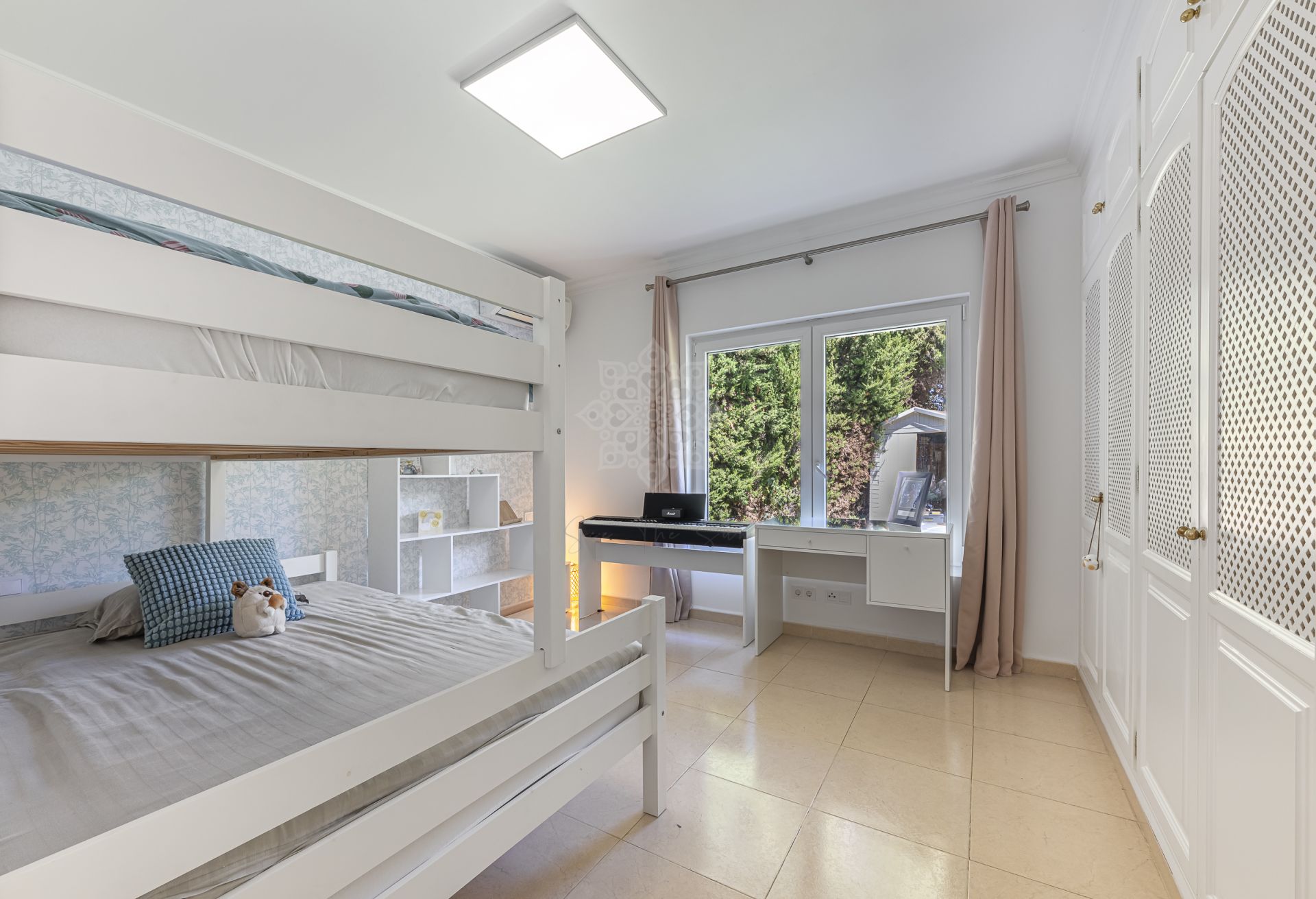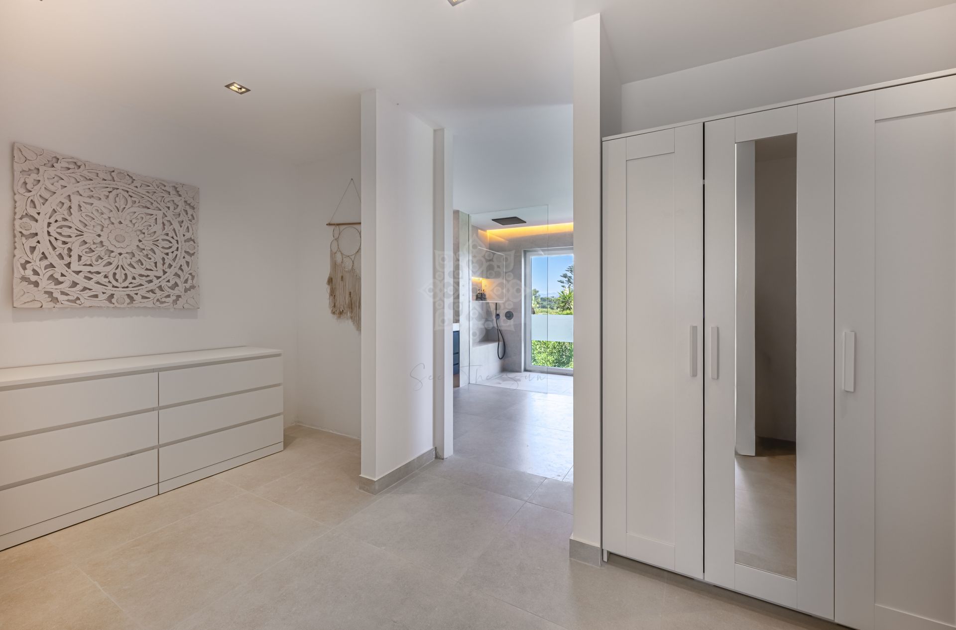 Distribuida en dos plantas, la propiedad cuenta con cinco dormitorios ensuite, incluidos dos elegantes dormitorios principales. Cada estancia ha sido diseñada con atención al detalle, priorizando la comodidad y el estilo contemporáneo.
