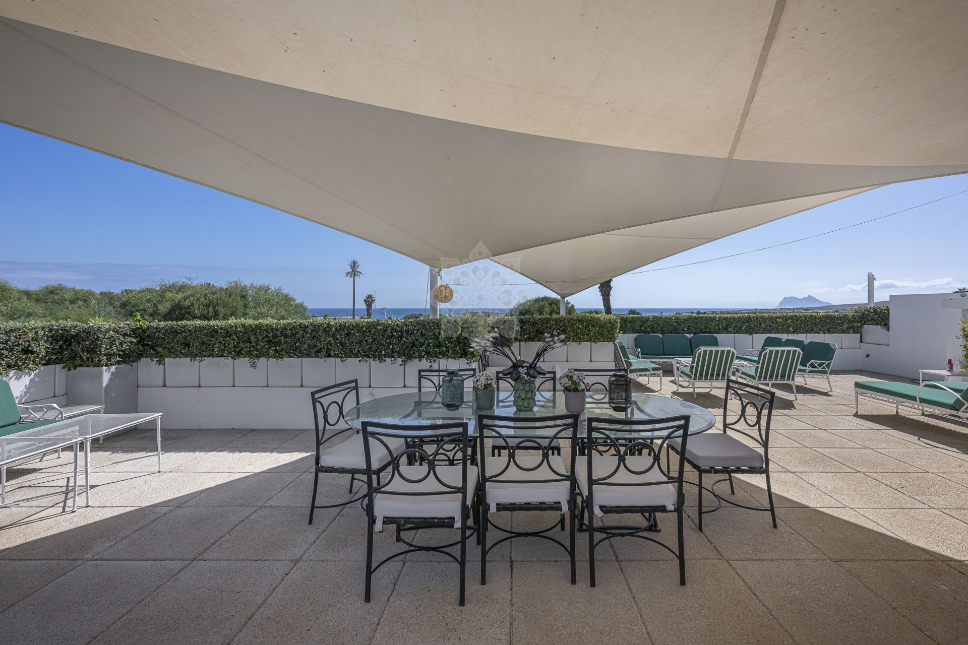 Exteriores y terraza: • Gran terraza cubierta con cortinas de cristal, ideal para todo el año • Terraza en la azotea con vistas panorámicas: playa, Peñón de Gibraltar, bosque de alcornoques y Mar Mediterráneo • Cocina en la terraza, perfecta para reuniones y entretenimiento