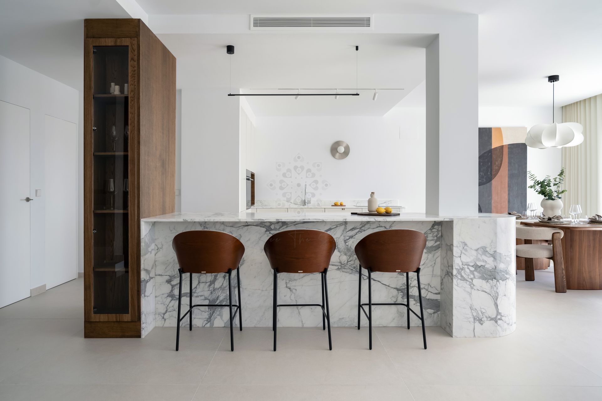 En la planta principal, la cocina, el comedor y el salón de concepto abierto se conectan directamente con una generosa terraza orientada al sur, perfecta para mañanas tranquilas o cenas bajo las estrellas. La cocina destaca por sus elegantes encimeras de mármol italiano y un bar de vinos integrado, mientras que un dormitorio de invitados en suite con su propia terraza ofrece privacidad y comodidad para los visitantes.